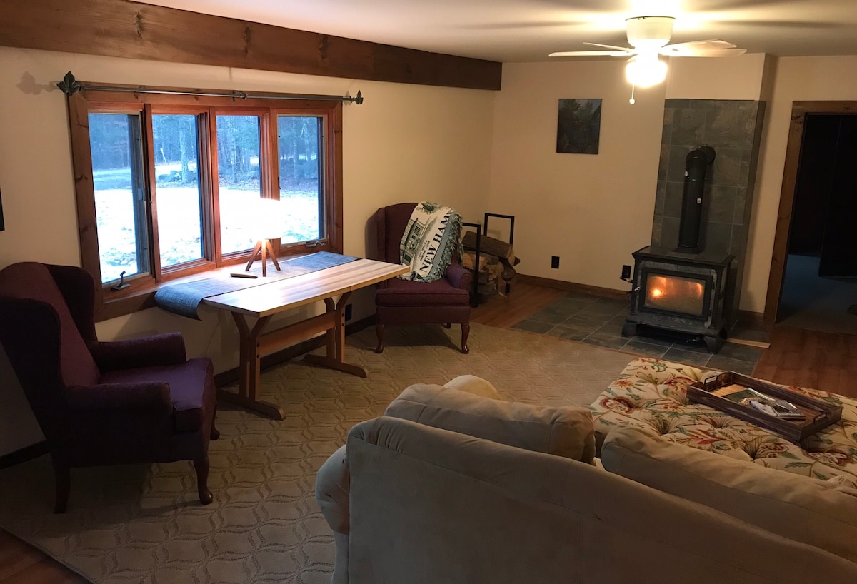 Se você procura solidão rústica, vai adorar o chalé aconchegante na floresta, um chalé de um quarto com painéis de pinho aninhado em um prado cercado por floresta e campos, a +/- 2 quarteirões da casa e da estrada. Se o tempo permitir, os veículos podem dirigir até a cabana. A cabana tem eletricidade e aquecimento, mas NÃO tem água corrente. A casa de banho atrás da cabana tem um vaso sanitário de compostagem Nature's Head. Os hóspedes podem tomar banho em um banheiro privativo na casa principal. Café da manhã incluso. Este é o "glamping" mais confortável e privado.