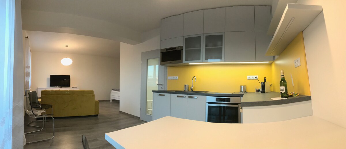 This modern brand-new apartment with a terrace is located on the first floor of an apartment building in the heart of Pilsen. You are welcome to use the fully equipped kitchen. The surface area of the apartment is 44 square meters. We speak english, german and french. Feel free to contact us for any further questions. We will be happy to give you tips regarding sightseeing, pubs etc. You can park your car in the underground garage directly in the building.