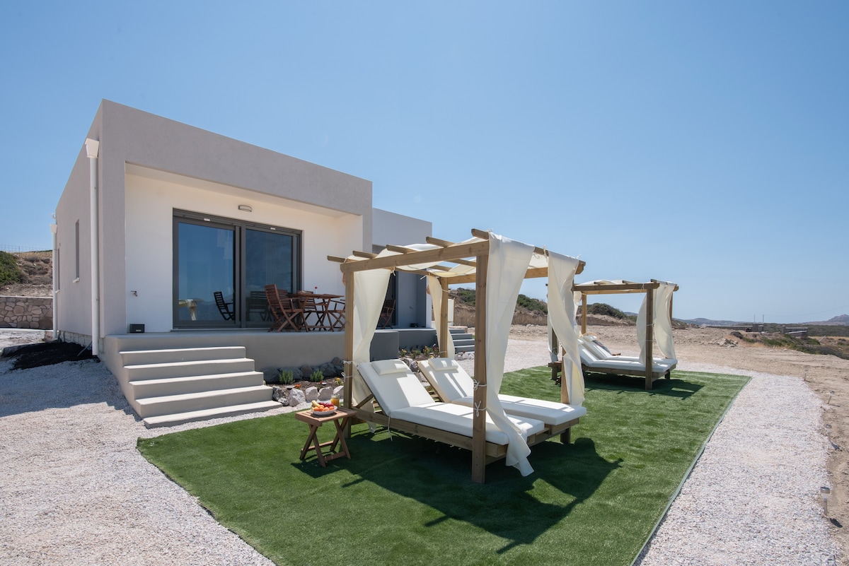 An open space beach house, of 60 s.m. for 6 pax with 1 double bed, 2 sofa beds and 2nd room with 2 single beds very stylish and comfortable. It is decorated with boho and cozy design styling combined with Cycladic culture. The house has direct access to a sea view veranda, with a big dining table. It is situated on a small bay, with similar moon white rocks as Sarakiniko that form a secluded cove in front of the house, together with Aqua house 1 & 3. Welcome basket with local products offered.