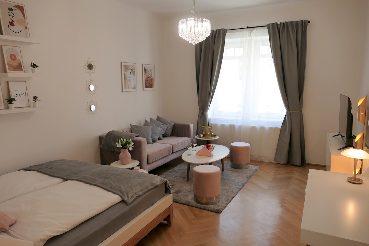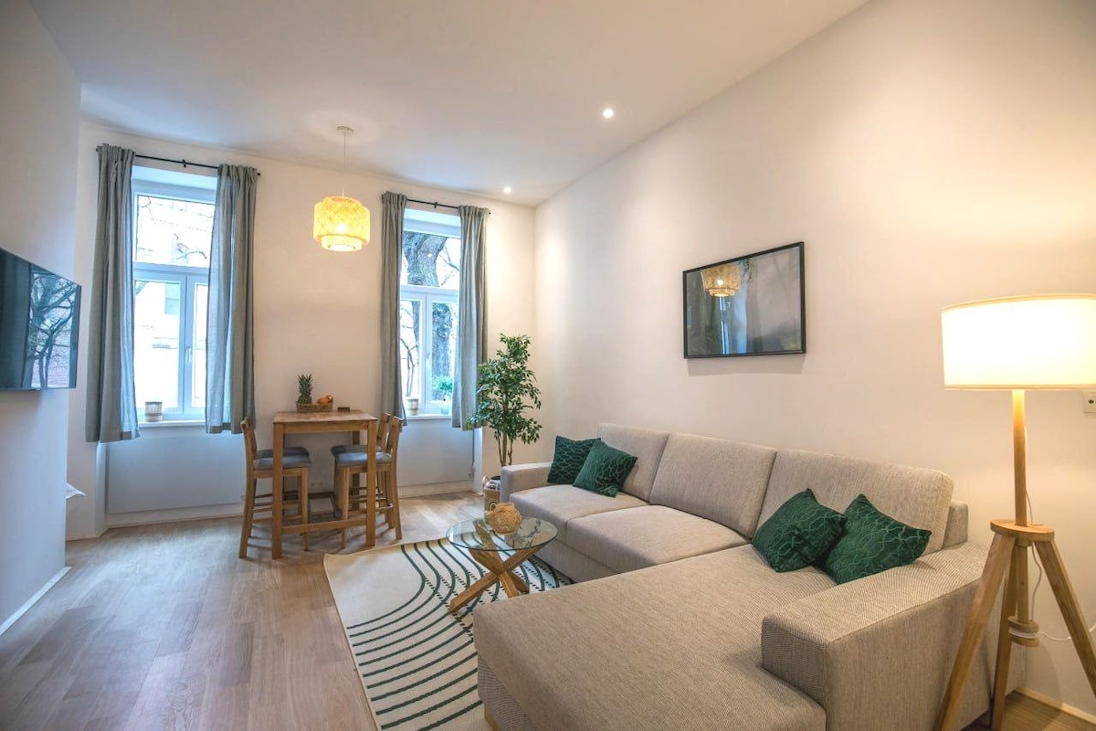 Inglês: Vida na cidade, mas confortável? Bem-vindo ao Ninho, onde Viena parece uma vila, enquanto a vibrante vida da cidade fica a apenas 10 minutos de distância! O apartamento espaçoso oferece todas as comodidades que seu coração deseja - Internet rápida, uma cama grande e confortável, ar condicionado, um sofá aconchegante para longas noites de cinema e uma cozinha bem equipada para experimentos culinários - você basicamente não precisa sair de casa em todo o estilo de moda pandêmica.