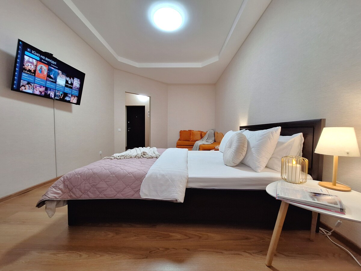 Человеческая жизнь построена так, что нам чуть ли не ежедневно приходится стоять перед тем или иным выбором, постоянно чувствовать себя в роли Гамлета, героя одноименной пьесы Уильяма Шекспира, и решать вечный вопрос: «Быть или не быть?» И аренда жилья в данном случае не является исключением. Каждый, кто выбирал себе квартиру, сталкивался с рядом на первый взгляд нерешаемых дилемм. Арендовать просторные апартаменты или предпочесть уютные? Взять квартиру в центре города или с прекрасным пейзажем за окном? Остановиться в новостройке или выбрать апартаменты в доме, надежность которого проверена временем. Вам трудно сделать выбор? Не проблема, вас устроит роскошная однокомнатная квартира в новом доме в центре города, которая настолько уютна и комфортна, что вам не захочется ее покидать. Судите сами: просторная гостинная и кухня, кондиционер, который поможет создать максимально приятный для вас климат, удобно расположеный балкон, которий предлагает панораму центральной части города, рядом находятся рестораны «Каштановая Аллея» и «Рафинато», дом досуга «Листопад», пиццерия «Челентано» и «Нега Бар», где вы сможете вкусно поесть и приятно провести время. Квартира настолько безупречна, что на первый взгляд кажется фантастической. Но это реальность. Не верите? Убедитесь!Удобства: - Большая двуспальная кровать - Раскладной диван- Кондиционер- ЖК телевизор + спутниковое ТВ- Wi-Fi Интернет - Газовая плита - Колонка-автомат (Автономное отопление) - Холодильник - Микроволновая печь - Электрочайник - Стиральная машина - Фен- Гладильная доска + утюг