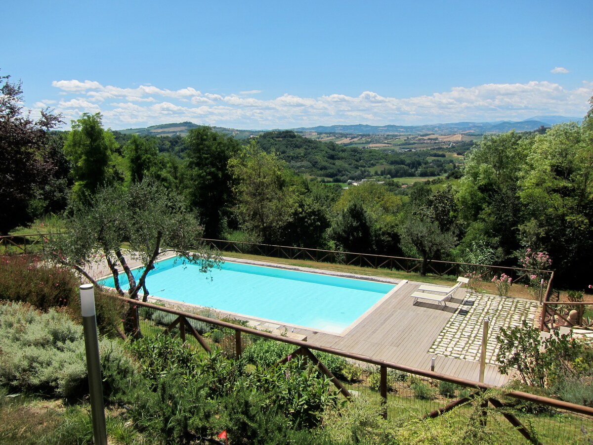 Casa de férias independente com um grande jardim localizado no meio do verdejante Parque Natural de San Bartolo e com vista para o azul do mar Adriático. A casa é um lar acolhedor e confortável de 100 metros quadrados, perfeito para pessoas que adoram estar na natureza e relaxar olhando para uma vista espetacular que vai desde as montanhas Appennini até ao mar. A casa, que foi recentemente remodelada, fica perto da aldeia de Casteldimezzo e da aldeia característica de Fiorenzuola di Focara.