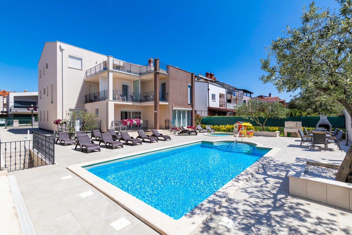Indulge in comfort at the modern "Astinian Residence Jadranka Pula" nestled in Štinjan village. Conveniently situated 5 km from bustling Pula and 3 km from picturesque Fažana center, revel in tranquility in a sun-kissed cul-de-sac. Just 400m from the sea, unwind in the lush garden, complete with a lawn, spacious swimming pool, terrace adorned with garden furniture, and barbecue facilities.