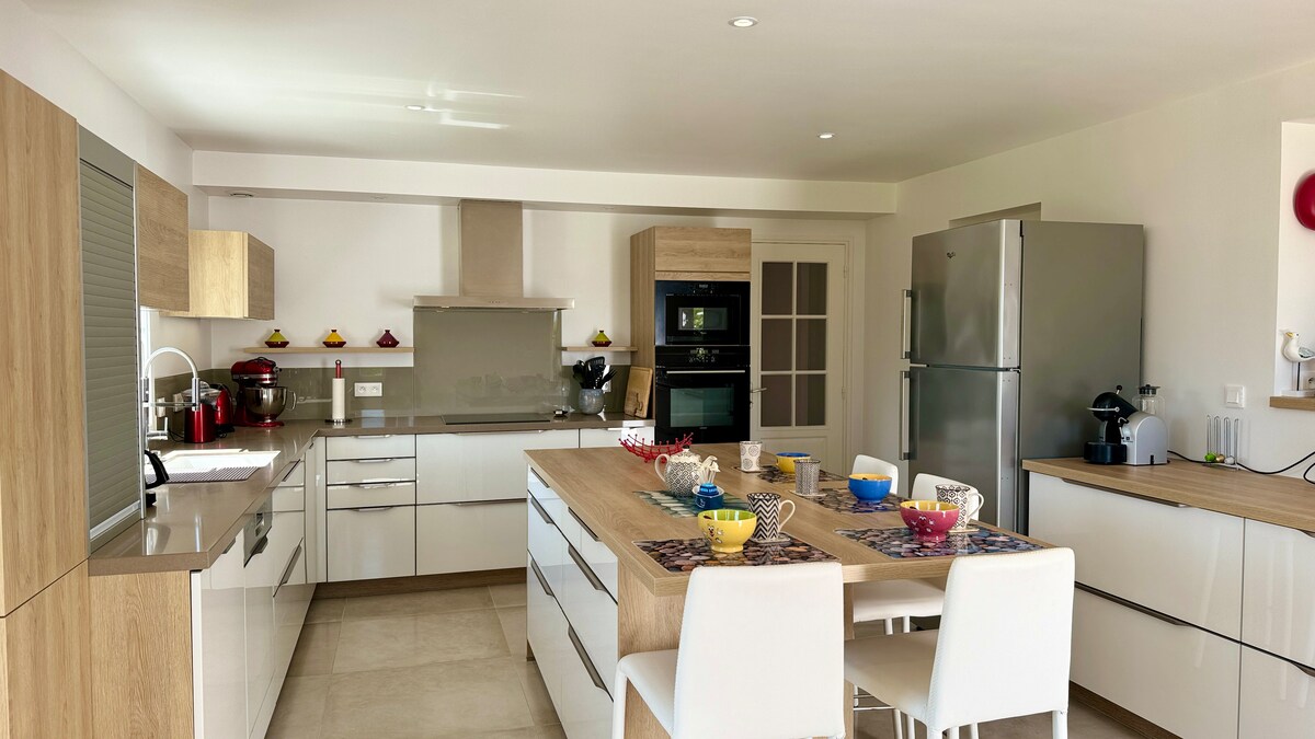Única ! Casa de praia de design em Morbihan, na Bretanha! Acesso direto à praia no final do jardim, A casa é nova, totalmente equipada e vocês são os únicos ocupantes das instalações, Vista direta da praia /do mar a partir da sala de estar, da cozinha, do terraço, do terraço e de um dos quartos no andar de cima. Lençóis, toalhas e limpeza incluídos, máquina de lavar e secar roupa. Muitas atividades nas proximidades: caminhadas, ciclismo, caiaque no mar, kitesurf, escalada em árvores, visitas culturais, passeios de barco...