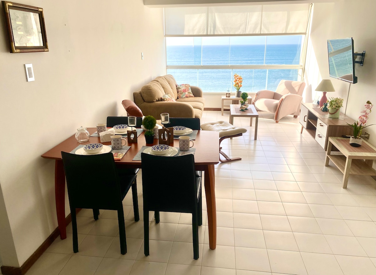 Apartamento acolhedor e confortável em frente à praia com vista panorâmica. Desfrute da brisa na varanda do 12º andar e ouça o mar do seu quarto. Nade na piscina, jacuzzi ou praia com acesso privativo, faça seu churrasco na piscina ou jogue tênis nas quadras, caminhe até o cassino ou restaurantes, ou faça compras no shopping do condomínio. O apartamento está totalmente mobiliado, também tem tanques de água, Wi-Fi e ar condicionado central.