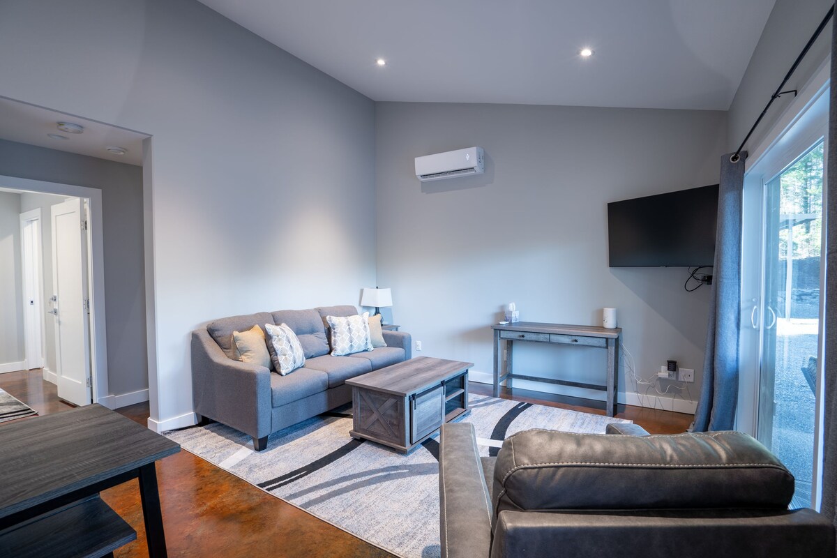 Esta casa de hóspedes imaculada com seu deck privativo e espaço de estar generoso convida ao conforto. Possui um charme rural único com muitas peças de mobiliário artesanais, juntamente com um longboard feito de cedro. Acomoda 6 confortavelmente com 2 quartos, (1 king e 1 queen), juntamente com um sofá-cama queen. Um banheiro com chuveiro, lavanderia e uma cozinha totalmente abastecida, você tem tudo o que precisa para se sentir em casa. Localizada no campo com trilhas nas proximidades e a apenas 5 minutos de distância das compras.