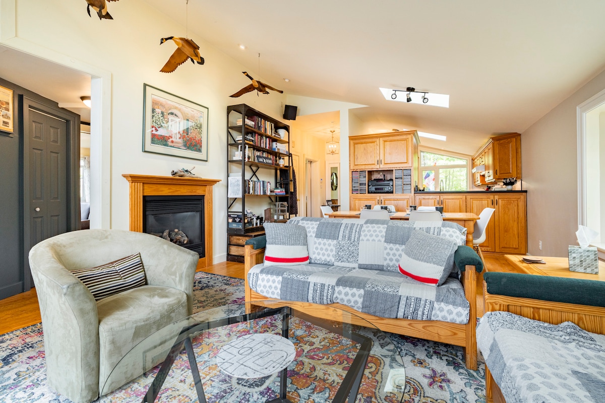 Iluminado e aconchegante, retiro de cabana de conceito aberto com vista para o rio Styx na bela West Grey. Relaxe ao lado de um rio tranquilo em um grande terreno com deck elevado, fogueira de madeira natural e churrasqueira. Este refúgio para todas as estações fica a 2 horas de Toronto, perfeito para famílias pequenas ou um pequeno grupo. Recentemente reformada, esta cabana apresenta uma decoração simples e moderna com uma cozinha totalmente mobiliada para refeições caseiras e assados. Também inclui Wi-Fi e uma sauna de barril de cedro a lenha externa.