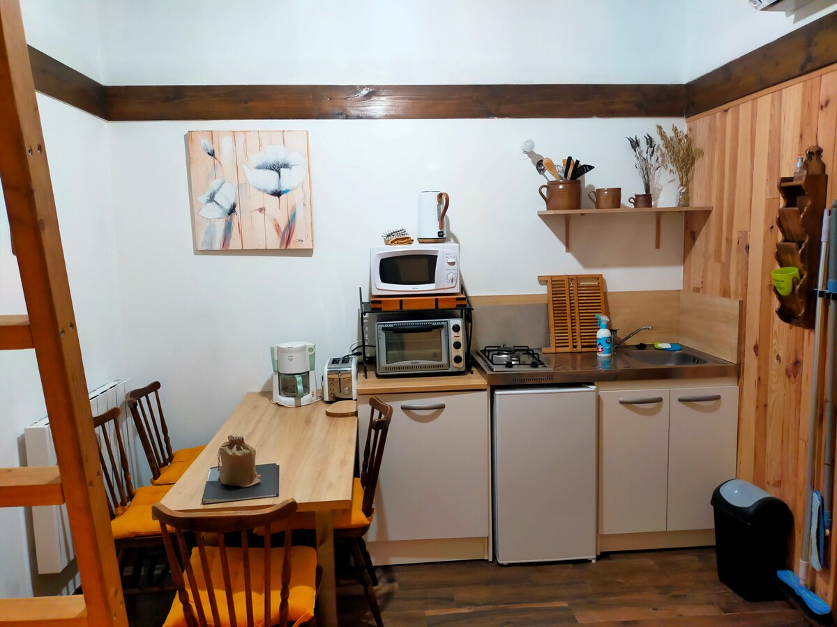 Olivier e Denis convidam-no a ficar na sua casa na árvore. Localizado na parte inferior do nosso jardim florido, facilmente acessível por uma escadaria que passa pelos áceres, o Cabane du Bon Chemin, aquecido e isolado, oferece um espaço de 26 m2 para o seu conforto, com TV e acesso Wi-Fi gratuito, incluindo uma área de dormir aconchegante: 1 cama de casal (140 x 190) e 1 cama dobrável (90 x 190).