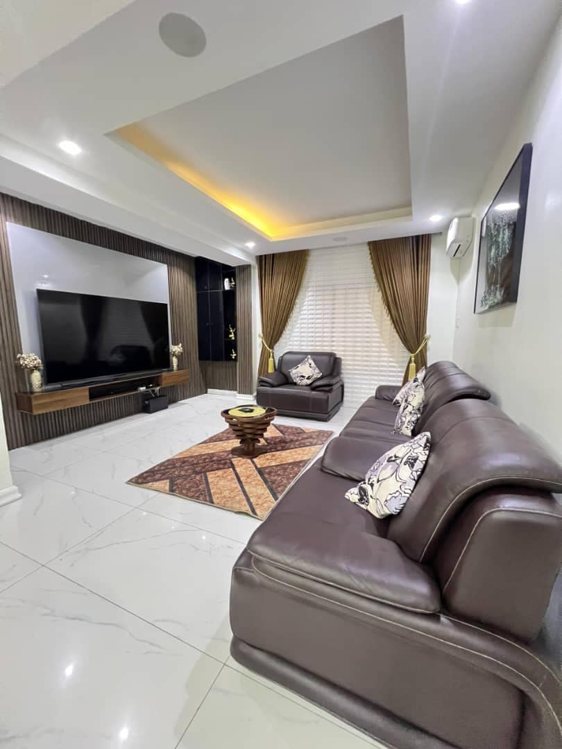 Step into a modern, fully furnished 2-bedroom apartment designed for comfort, convenience, and style. Living Room: A spacious, tastefully decorated living area featuring a comfortable leather sofa set, center table, flat-screen Smart TV, entertainment console, and air conditioning. Elegant curtains, a soft rug, and framed wall art complete the cozy ambiance ⚙️ Additional Features: Constant electricity or backup generator/inverter. High-speed Wi-Fi Washing machine Secured parking space