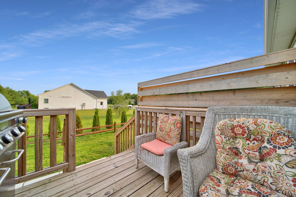 Você não vai ficar na casa da vovó aqui! Nossa casa de campo limpa e arrumada está cheia de atualizações e espaço para toda a sua família, amigos e animais de estimação. 2 quartos privativos e espaço para levar as crianças no loft. Estamos a apenas uma curta caminhada de 1 dos 8 acessos privados ao lago que você pode usar! Nosso espaço ao ar livre está perfeitamente preparado para férias e tem uma NOVA BANHEIRA DE HIDROMASSAGEM! Desfrute do seu café no deck da frente, grelhe no pátio dos fundos e sente-se ao redor da fogueira depois de escurecer no quintal cercado com privacidade.