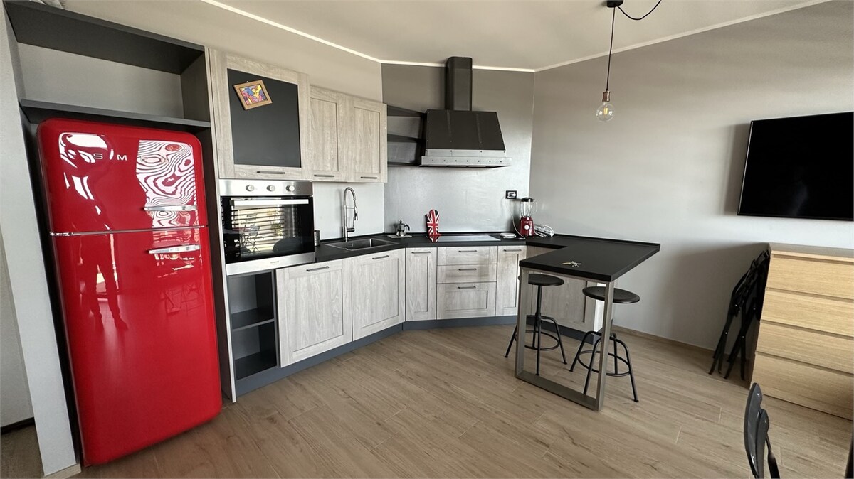 Apartamento de luxo localizado a apenas 30 metros da praia, recomendado para uma ocupação ideal de 2 adultos e 2 crianças para garantir o máximo conforto durante a estadia. O alojamento tem: - Terraço com vista para o mar, mobilado com sala de estar e mesa de jantar; - quarto duplo com casa de banho privativa, sala de estar com sofá-cama (não há persianas na sala de estar); - 2 televisões inteligentes, Wi-Fi e ar condicionado em todos os quartos, máquina de café; - 1 lugar de estacionamento.