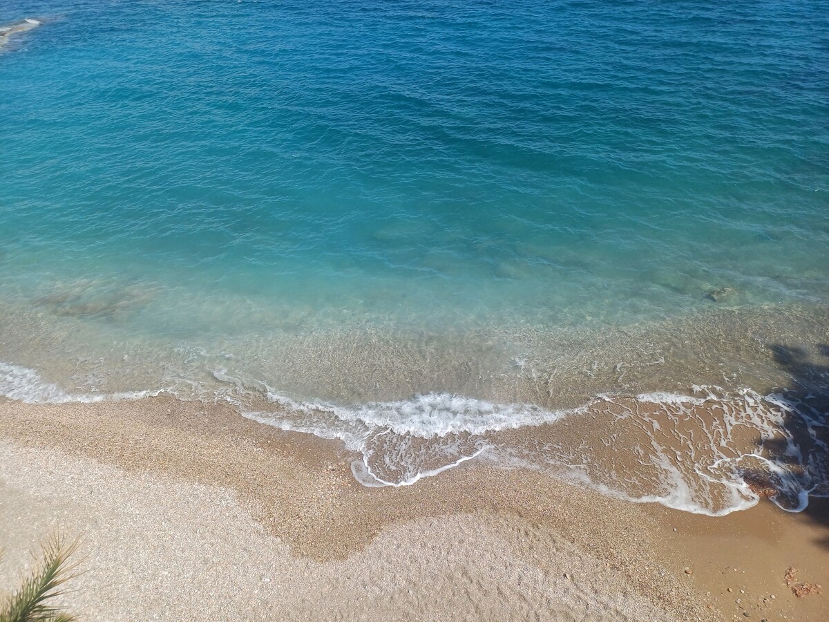 Beach Little Castle 20m² na praia a área mais desejável da cidade, estúdio com uma cama de casal, frigorífico, ar condicionado, casa de banho e chuveiro é novo em folha feito em 2025 e agora está localizado no castelo, enorme jardim com passarelas e praia quase privada. Vistas magníficas, ambiente confortável e panorâmico. Perto do aeroporto de Atenas e do Porto de Rafina. Alguma área de jardim exterior pode ser partilhada com outros hóspedes da Silis Beach House.