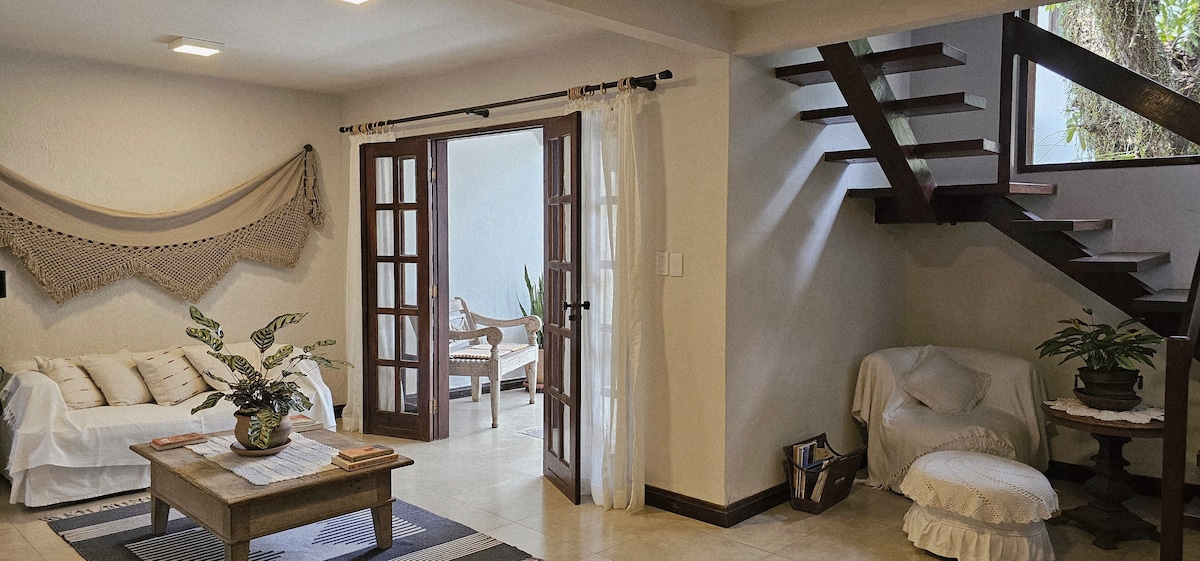 Casa de praia aconchegante no meio da Natureza a pasos do mar. O Lar de ferias para quem procura conforto e tranquilidade. Ideal para desfrutar momentos muito especiais em casal ou familia com privacidade e segurança. Varanda e Espacos priv. para relax no jardim, posibilidade de uso da área de lazer de resort beira mar. Wi-fi home-office. TV 32" com Netflix. Parking priv. interno. Facil e rapido acceso ao centro de Arraial e de Pto.Seguro. Ar condicionado. Churrasqueira . Não é condominio.