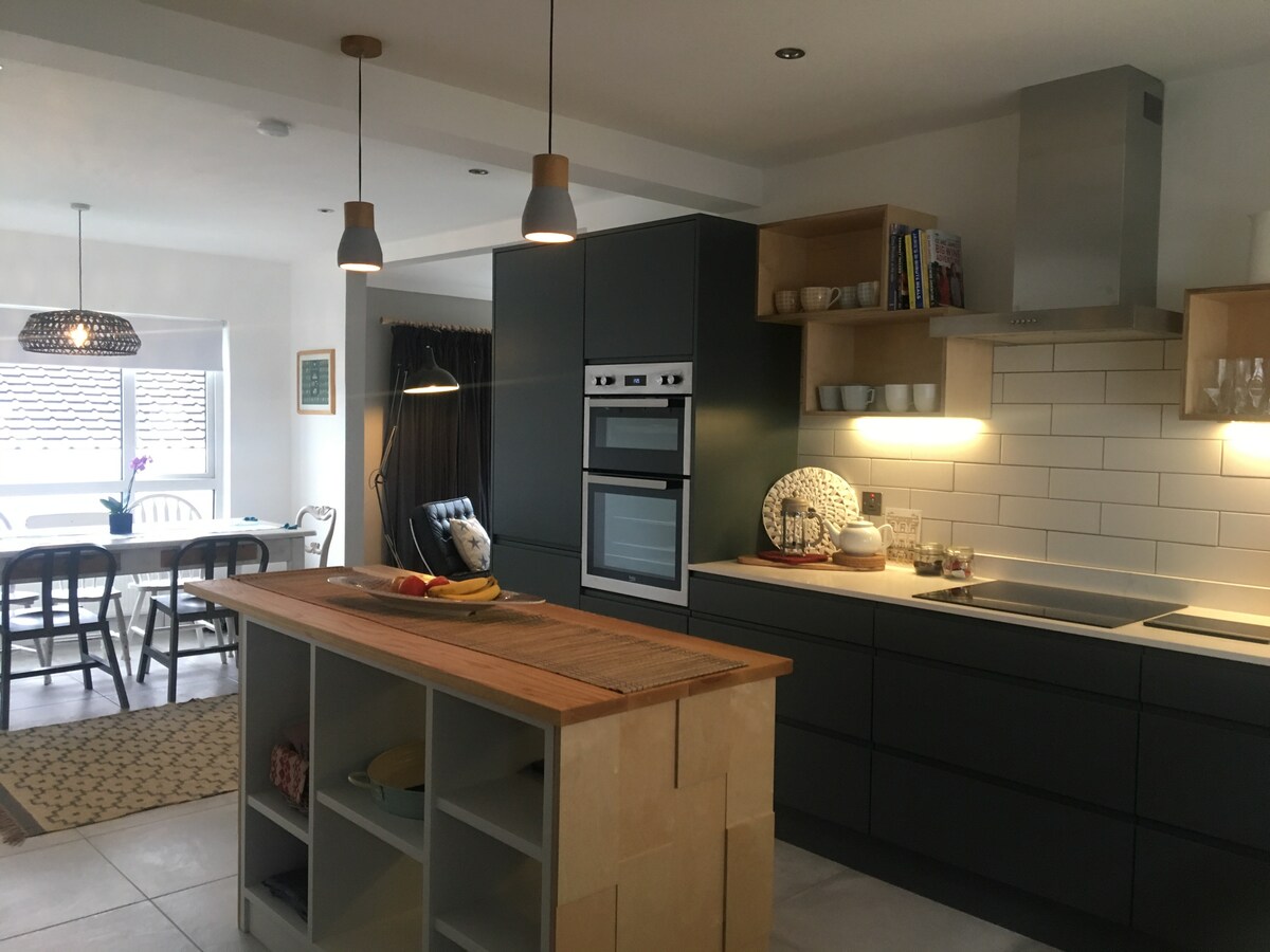 Casa de 3 quartos espaçosa e bem iluminada. O andar de cima tem sala de estar com TV e canais gratuitos para ver, além de quarto principal com banheiro privativo no andar de cima. Mais 2 quartos duplos no andar de baixo, bem como cozinha/sala de jantar, utilitário e banheiro familiar. Todos os quartos e cozinha equipados com tomadas de carregamento USB. Chuveiros elétricos em ambos os banheiros. Estacionamento na rua adequado para 2 carros. Área pavimentada fechada na parte de trás e na lateral da casa com cerca de 6 pés que também inclui varal. Área de armazenamento sob as escadas.