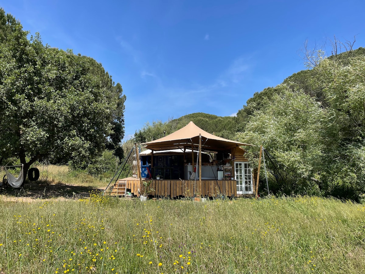 Estamos aninhados na bela paisagem rural entre a cidade de Castelo Branco e Fundão. Esta bela tenda está situada bem na beira da nossa terra. Em um espaço tranquilo e encantador entre as árvores, com vista para a Serra da Gardunha. Oferecemos uma cama de casal, pequena cozinha com panelas e frigideiras, fogão a gás, geladeira com pequeno compartimento congelador, banheiro de compostagem, chuveiro e lenha para o queimador de lenha nos meses mais frios. Toalhas e lençóis fornecidos. Descontos para reservas semanais.