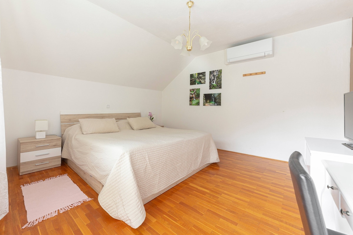Nosso apartamento de 2 quartos com 1 banheiro, cozinha, sala de estar espaçosa com sofá e mesa de jantar, A/C e pátio espaçoso está localizado a cerca de 100 metros do Lago Bled (área de natação). Está localizado em uma área muito tranquila. Tem sua própria entrada e está localizado em nossa casa (então estamos sempre por perto para ajudar). Somos uma família de 5 pessoas e ficaremos felizes em hospedar você. Sustentabilidade: Produzimos mais energia do que usamos. O imposto de turismo (3,13 para adultos por dia, 1,56 para crianças acima de 7 anos) não está incluído.