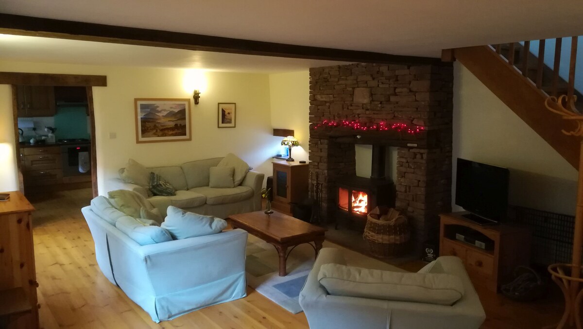 Bela conversão de celeiro perto da base de Mynydd Troed (Foot Mountain) no Parque Nacional de Brecon Beacons. 1,5 km do lago Llangorse, 10 km de Hay-on-Wye. Entre pela varanda emoldurada de carvalho na grande área de saída em plano aberto com uma cozinha bem equipada e área de estar confortável com fogão a lenha e TV grande. Há também um banheiro no andar de baixo e um conservatório. Lá em cima há 2 quartos duplos de bom tamanho, banheiro e varanda.