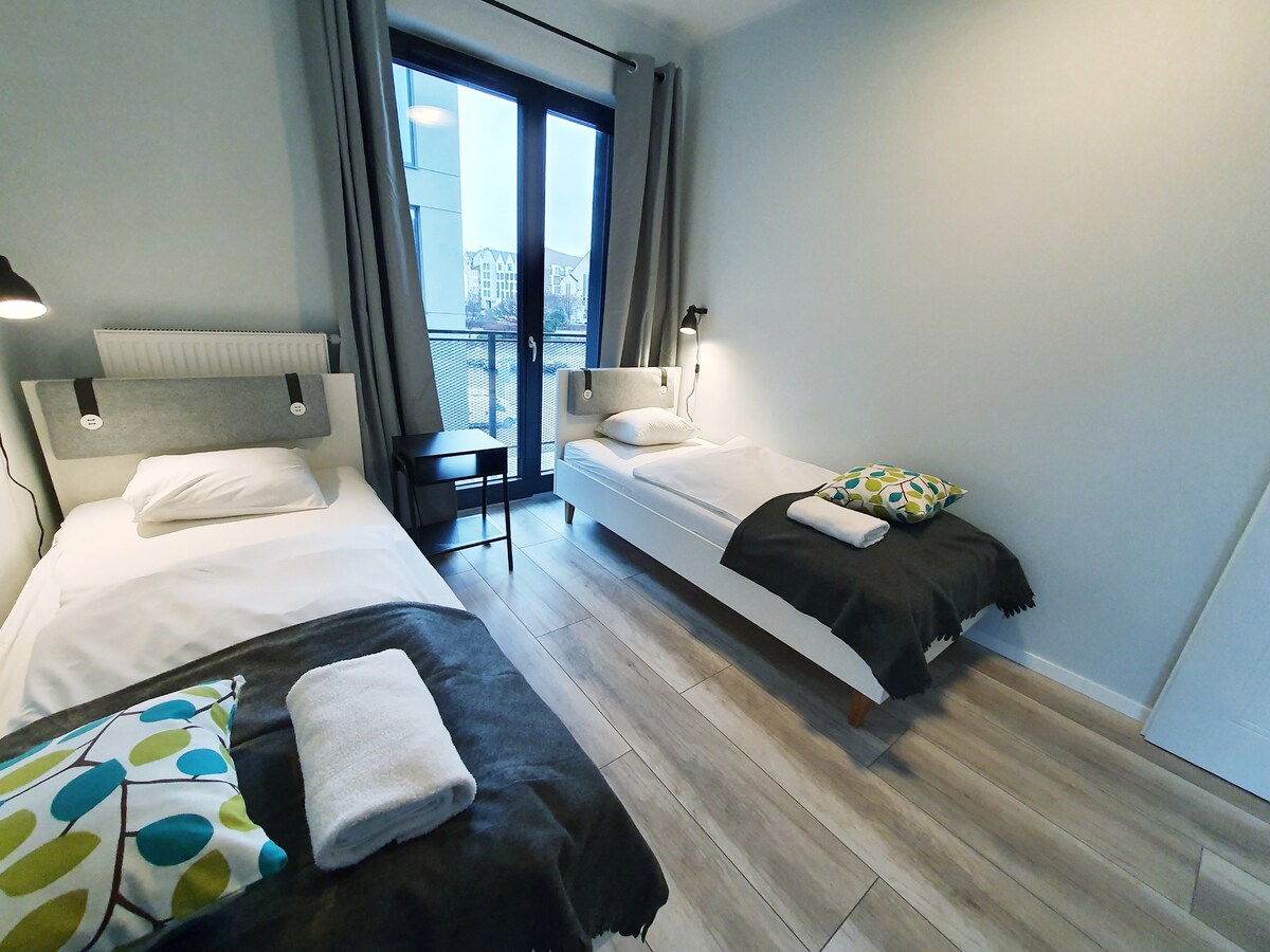Descontraia, relaxe e aproveite a sua estadia neste apartamento novo e espaçoso. Está localizado no 12.º andar da Torre Famma, oferecendo uma bela vista para a cidade e os seus arredores. Nas proximidades, encontrará o Parque Sołacki – perfeito para descontrair entre vegetação e pássaros – bem como o mercado Jeżycki, onde pode fazer as suas compras. O edifício dispõe de segurança 24 horas por dia, 7 dias por semana, para além de acesso vigiado e controlado tanto à propriedade como ao próprio apartamento.
