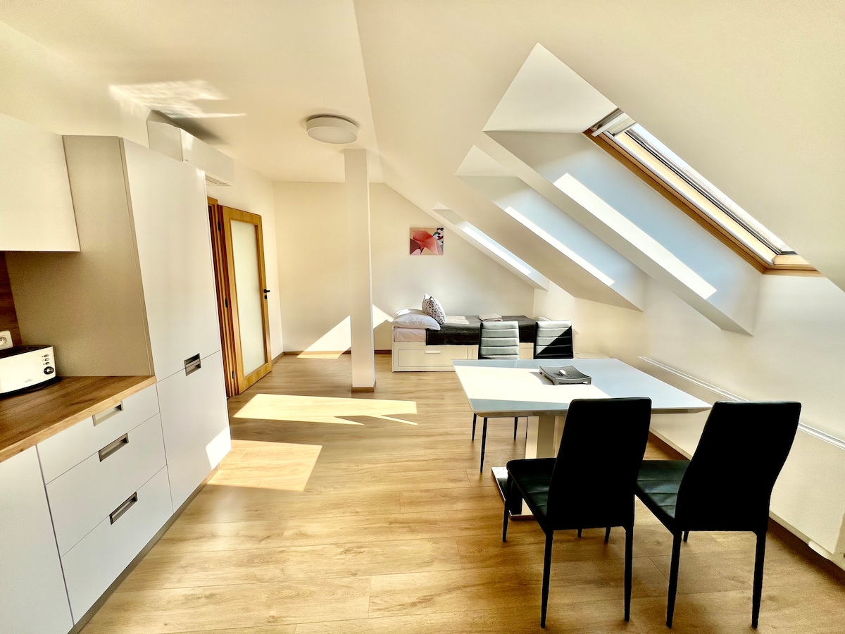 Fique em grande estilo no nosso estúdio chique Karlin! Depois de um dia explorando a cidade, relaxe na nossa varanda tranquila com uma bebida na mão. O estúdio está perfeitamente equipado para uma estadia confortável - desde uma cozinha totalmente abastecida, até Internet de alta velocidade para trabalho ou entretenimento, e até mesmo uma máquina de lavar e secar roupa para tornar suas viagens livres de problemas. A melhor parte? Oferecemos estacionamento na garagem do edifício, por isso não se preocupe em encontrar um lugar. Venha e experimente a autêntica vida de Praga no coração de Karlín!