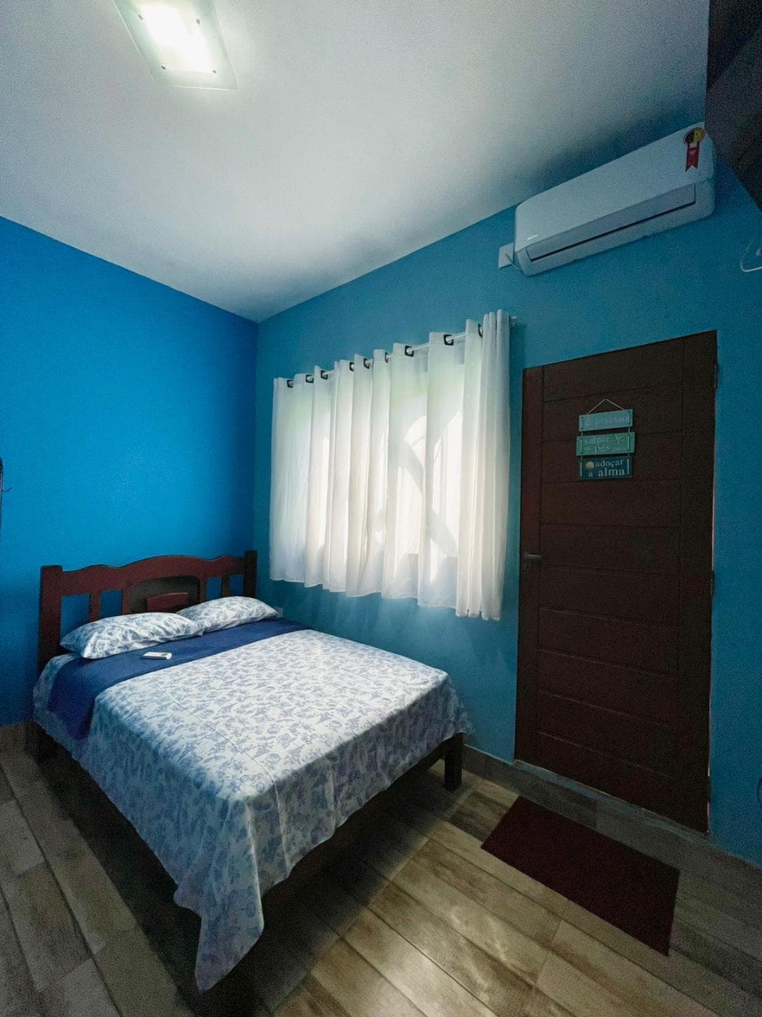 Suíte pequena e aconchegante (quarto com banheiro individual) com ar condicionado, cama de casal tamanho Queen, super confortável com muita privacidade. A suíte ainda tem uma cama de solteiro, se precisar de um espaço a mais para familiares .Lençóis de Percal 100% algodão, de pelo menos 200 fios, toalhas de banho. A suite está equipada com um frigobar. A rua é tranquila e permite estacionar com segurança.A casa possui apenas duas vagas de carro no estacionamento,o uso é por ordem de chegada.