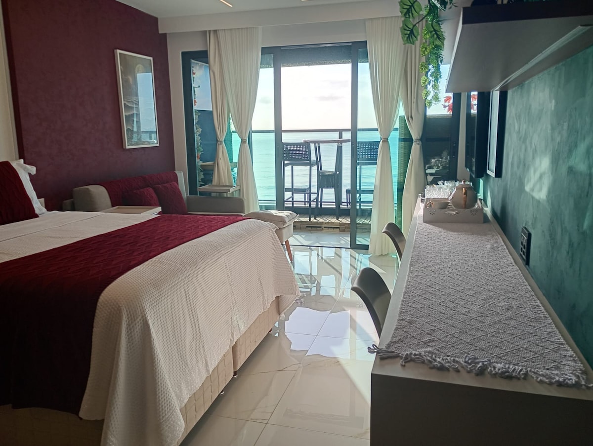 Aconchegante studio, com vista mar! Localizado em frente à praia, a poucos metros do centro de convenções, de supermercado e restaurantes. Oferecemos aos hóspedes: 🛏️ Cama Queen e cama de solteiro 🛜 Wi-fi 📺 TV aberta 💨 Ar condicionado 🧺Roupa de cama e toalha de banho 🏊♀️Piscina 🌅 Rooftop vista mar 🏋️♀️Academia 🧑💻Co-Working 🛁 Spa com banheira de hidromassagem 👮♂️Portaria 24 horas com segurança 🚙 Estacionamento gratuito 👚🫧Lavadora e secadora 🍳Cozinha completa