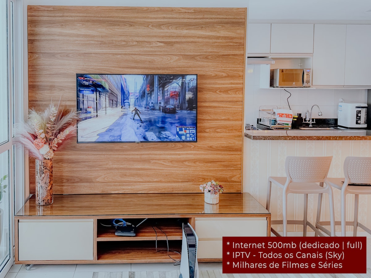 Apt inteiro, ar cond, garagem, 5min praia, apt 107