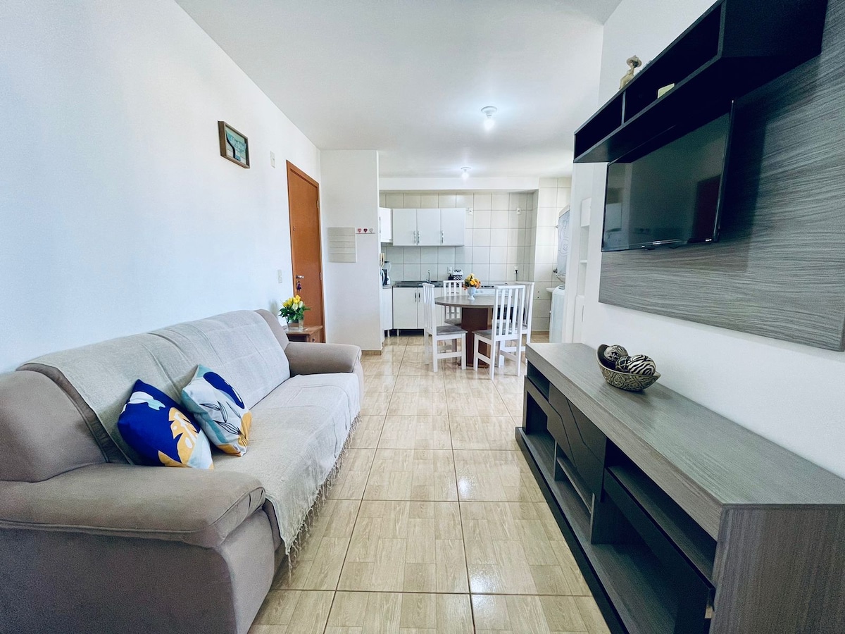 Apartamento com linda vista do mar. Rede de proteção em todas as janelas. Wifi própria. Ar condicionado em todos os ambientes. 2 quartos que acomodam até 4 adultos (18+) e 2 crianças com colchão. TV Smart 42 na sala. TV Smart 32 na suíte. Totalmente mobiliado com eletrodomésticos, utensílios de cozinha. Roupas de cama e banho. 1 vaga de garagem coberta próximo a porta. Localizado em belo condomínio, com piscina, academia, playground, sala de jogos, quadras de areia e grama, segurança 24hrs.
