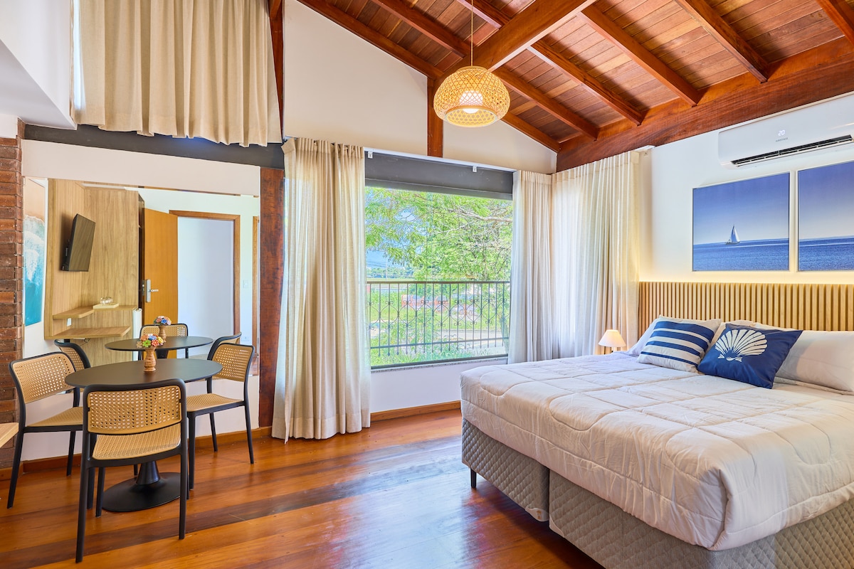 Charmosos estúdios self catering na linda praia do Prumirim. Entrada independente, pátio privado, cozinha totalmente equipada, cama queen size de alta qualidade, sala de estar confortável. Tudo projetado com qualidade, conforto e estilo. Grandes janelas panorâmicas que vão fazer você se sentir entre as copas das árvores! Este é um lugar mágico para quem procura uma fuga romântica à beira-mar conectando-se à natureza sem comprometer seu conforto. Tudo meticulosamente limpo, sanitizado e seguro!