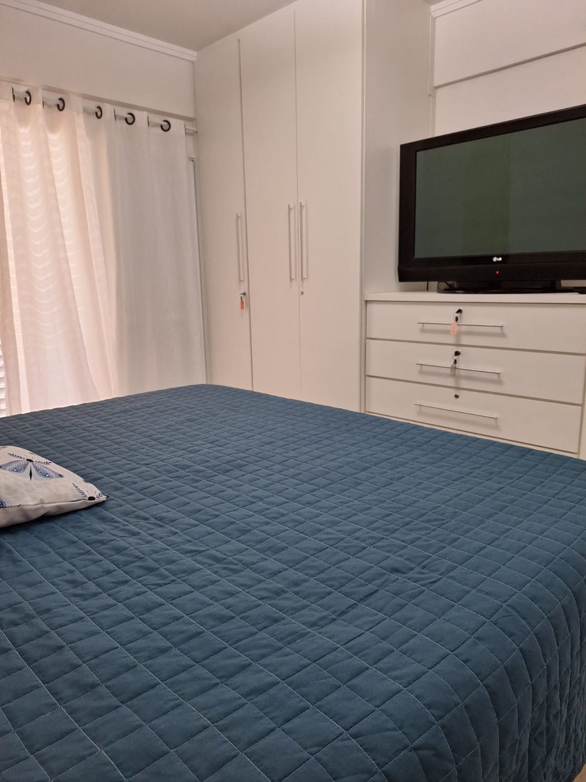 Apartamento super aconchegante de 54m², recentemente reformado com móveis novos, ideal para Casal com filhos, até 04 Hospedes, com vista espetacular para as praias do Tombo, Guaiuba e para o Serra do Forte dos Andradas. Quarto e Sala integrados com Sacada ampla e protegida por rede de proteção para crianças, Ar-condicionado Split na Sala e Quarto, cozinha completa e equipada com eletrodomésticos novos. Quarto casal com cama "Queen Size", e Sala com 02 sofá-cama de solteiro padrão.