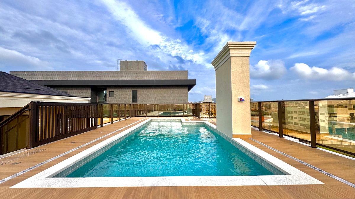 Apt com garagem e piscina aquecida a 50m da praia