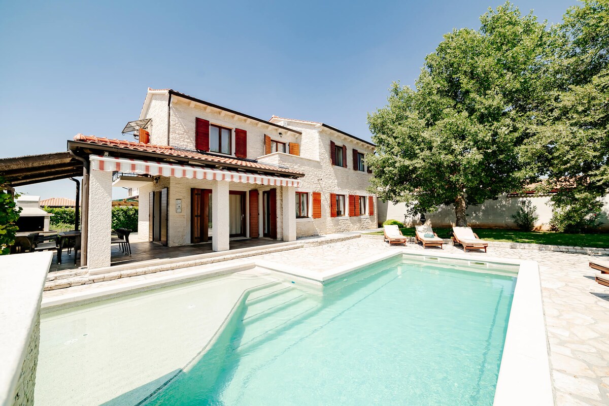 Bem-vindo à Ístria ocidental, à autêntica casa de pedra isolada de 1850. Apenas 20 minutos de carro da praia e de Poreč, Património da UNESCO. Hilltop Motovun fica a 10 minutos de carro, Višnjan, com um supermercado, a 5 minutos. Desfrute da sua própria casa de 2 quartos com pátio totalmente vedado, 2 aparelhos de ar condicionado, piscina, trampolim, churrasqueira, estacionamento gratuito e refeições ao ar livre. Respeitamos a sua privacidade e gostamos de partilhar a hospitalidade, se quiser. É possível comprar vinho e azeite na aldeia ou pedir bicicletas emprestadas. Um animal de estimação é gratuito!