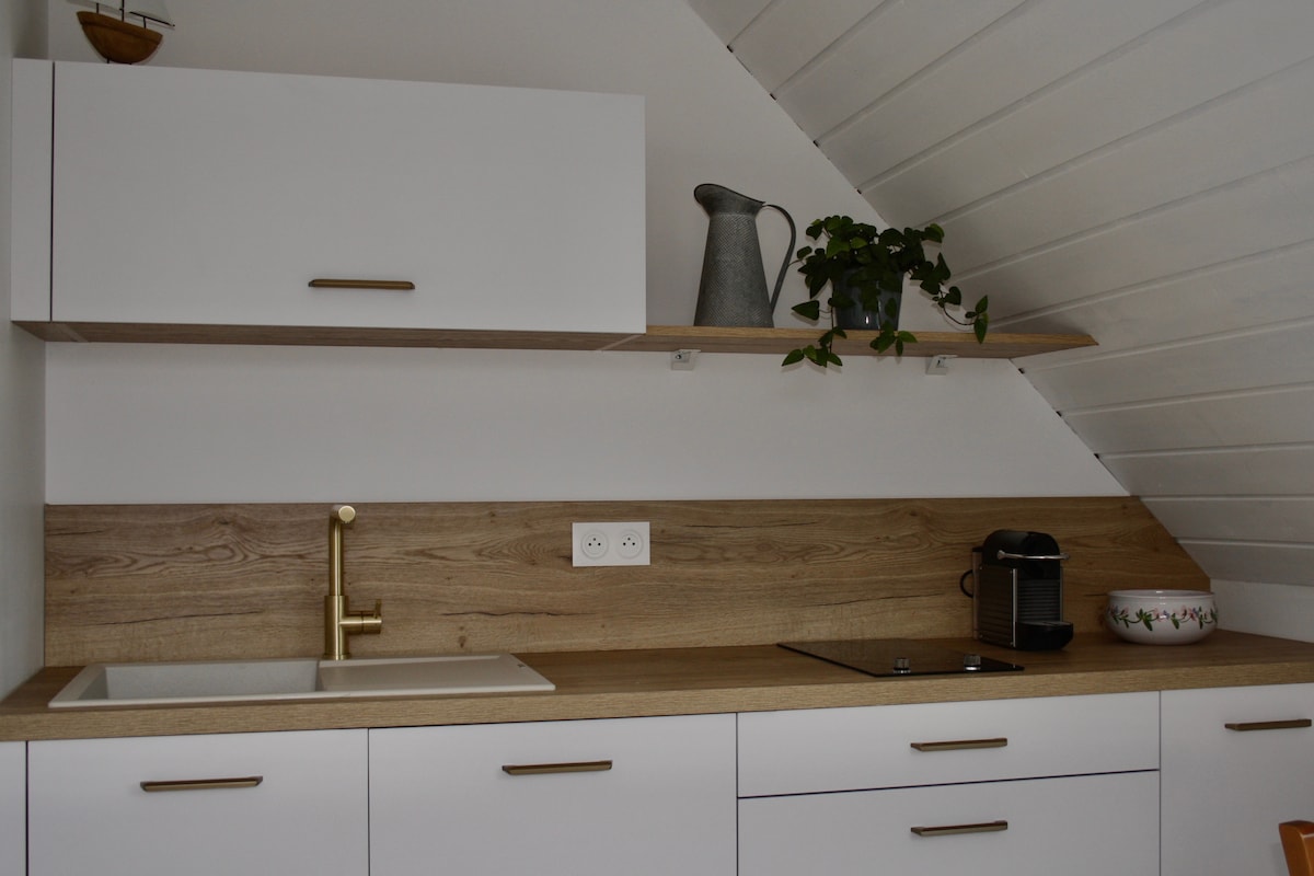 Quarto espaçoso com um mezanino equipado com uma área de estar ou de dormir (2 camas de solteiro). Ideal para famílias com crianças. Banheiro e toalete privativos. Entrada independente. Disponibilização de uma área de cozinha para a preparação de cafés da manhã e refeições. Idealmente localizada perto de praias, trilhas (GR 34) e uma via verde diretamente acessível a partir da acomodação a pé ou de bicicleta.