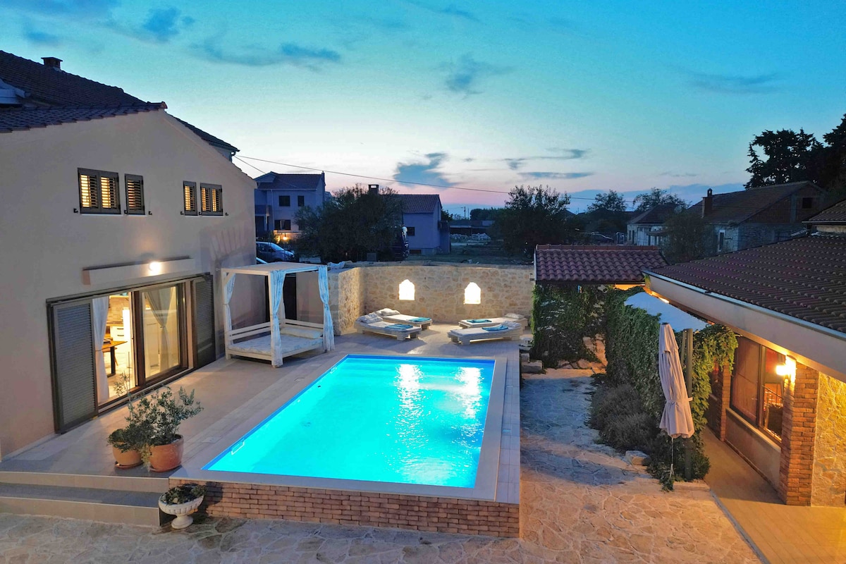 Esta bela moradia com piscina aquecida, banheira de hidromassagem e sauna está situada numa paisagem remota e isolada com uma vista deslumbrante sobre o vale Piscina aquecida de abril a novembro Ótimo lugar para relaxar e um ponto de partida para explorar a região e a Croácia! Distância da cidade Zadar fica a 28 km (aeroporto a 20 km) Šibenik fica a 50 km de distância Split fica a 125 km (aeroporto a 99 km). Distância de atração Lagos Plitvice a 125 km de distância Krka a 45 km de distância Kornati a 30 km de distância