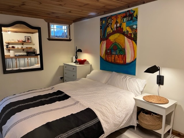 I have endeavored to create a comfortable space that provides a wonderful base for adventuring. The walls are covered in local art, I love showcasing local artisans. Paintings are reminiscent of Nelson and are for sale. The beautiful king sized bed and live edge wood counters are taken from sustainably harvested trees and created by a local craftsman. The upstairs is spacious and features a wood burning stove. The downstairs is a beautiful grotto bathroom with a sunken tub big enough for two.
