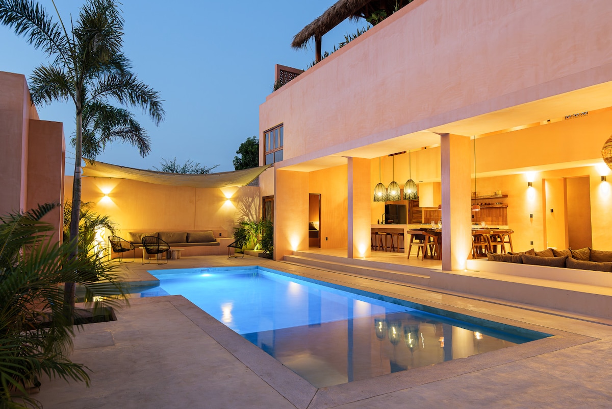 Bem-vindo à Casa Cali, o seu refúgio tropical em La Punta de Zicatela, Puerto Escondido. Esta moradia espaçosa e elegante acomoda até 9 hóspedes em 4 quartos lindamente concebidos, oferecendo vistas deslumbrantes para o Oceano Pacífico e generosas áreas de estar interiores e exteriores. Desfrute de uma grande piscina rodeada por vegetação exuberante e de uma piscina de mergulho no terraço do último piso, perfeita para pôr do sol, ioga ou observar as estrelas. Localizado a uma curta distância a pé da praia de La Punta e dos seus melhores restaurantes e cafés.