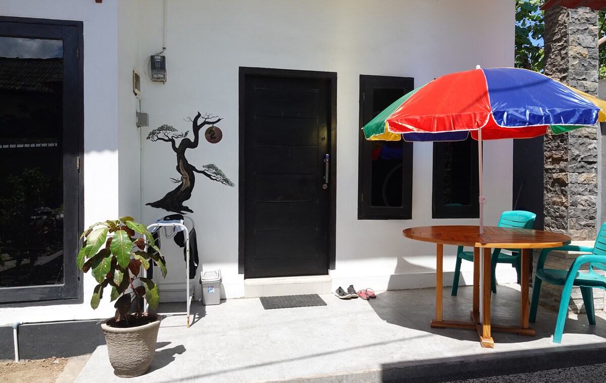 O nosso espaço fica numa pequena aldeia lateral a cerca de 10 minutos a pé da praia perto de small warung, fácil de obter qualquer coisa