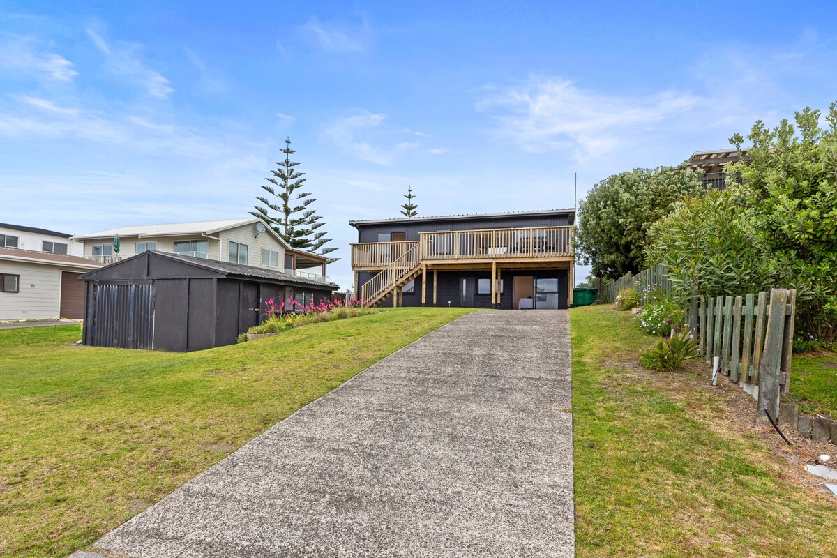 Mesmo no topo da praia, o deck privado tem vista para o infinito Oceano Pacífico Do nascer ao pôr do sol!🌅 Uma bela e longa praia de areia branca, perfeita para longas caminhadas, nadar, remar ou pegar uma prancha de boogie Reúna conchas, apanhe um peixe ou cave para tuatua, tudo à sua porta O interior é caseiro e bem abastecido Relaxamento instantâneo, muito sol e sofás confortáveis, ar condicionado disponível. Sente-se e desfrute da vista com o som tranquilo das ondas