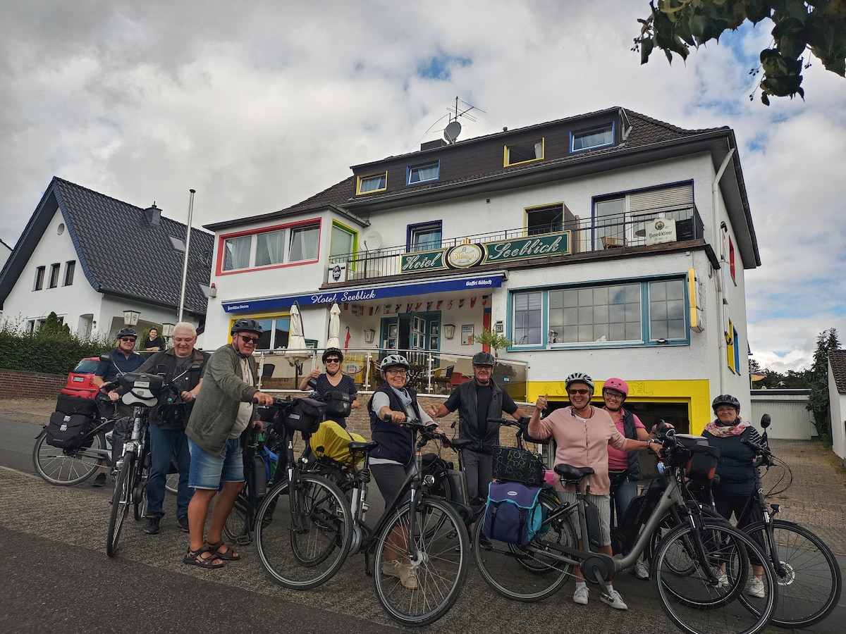 "wir sind ein familienbetrieb seid 100 jahren und unser hotel liegt in der köln-bucht genau in der mitte zwischen köln und düsseldorf. unsere zimmer verfügen alle eine nasszelle,wc,telefon,fernseher mit sky und free w-lan. der ortsteil sinnersdorf hat ca 6000 einwohner ist ca.2 km von der a57 entfernt. von uns aus erreichen sie die kölner und düsseldorfer messe in kurzer zeit. messeglände köln 18 km. messegelände düsseldorf 25. bahnhof pulheim 3 km."