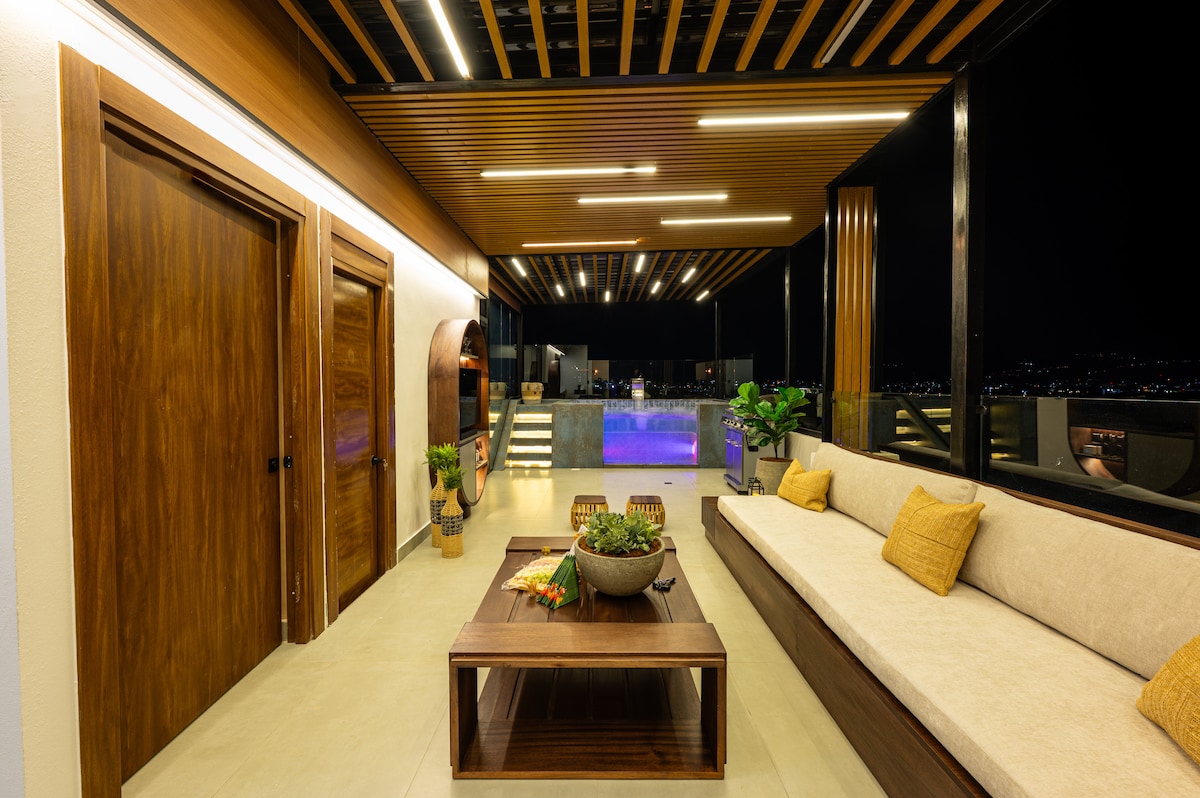 Experience the ultimate blend of style and privacy. What you’ll love: • Private Jacuzzi: Large, modern, and just for you. • Outdoor Living: Terrace with rattan furniture, BBQ, and lush decor. • Luxury Interior: 75" Smart TV, AC, and designer finishes. • Kitchen & Bar: Sleek space with a full cocktail bar setup. • Premium Bath: Ultra-modern dark textures and rainfall shower. Perfect for romantic getaways or elite travelers. Book now!
