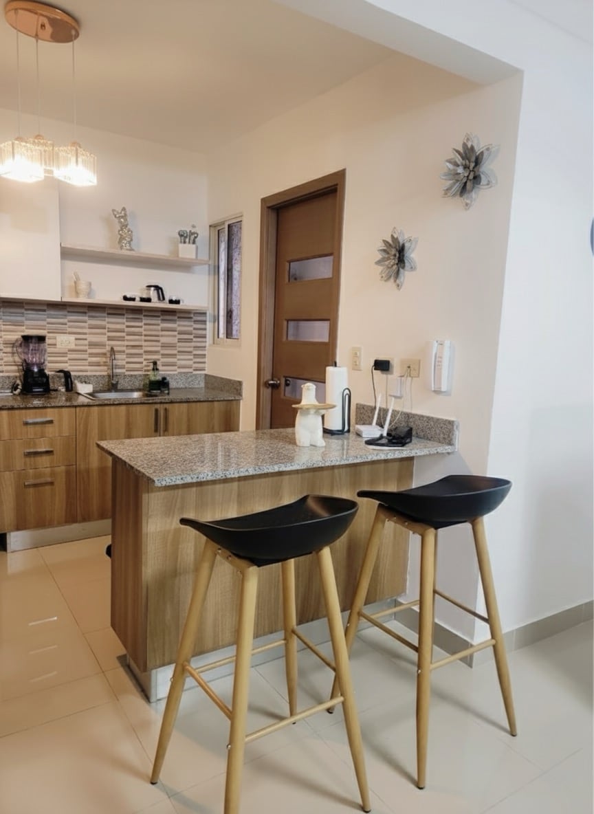 Welcome to your perfect escape in Santiago! Just 10 minutes from Cibao Airport and the city center, this modern, fully furnished apartment features 4 bedrooms. Three have A/C, and the fourth (service room) has no A/C but includes a fan, private bathroom, and twin bed. The apartment also offers 3 bathrooms, two living rooms, smart TVs, Bluetooth speakers, a fully equipped kitchen, and parking. Enjoy a pool, playground, gym, and more in a secure complex near shops and clinics.