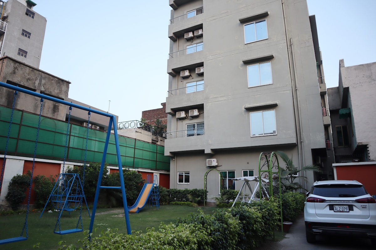 RUA ESTRITA PARA FAMÍLIAS, LIVRES E CASAIS Situado no coração de Lahore, o Hayyat Luxury Hotel Apartments é um refúgio de conforto e luxo. Nosso apartamento possui uma espaçosa área de estar completa com uma smart TV e área de jantar. Nossa cozinha totalmente equipada oferece todas as conveniências de uma casa, incluindo forno, micro-ondas, torradeira e chaleira. Delicie-se com um banho relaxante no banheiro privativo, completo com produtos de higiene pessoal gratuitos.
