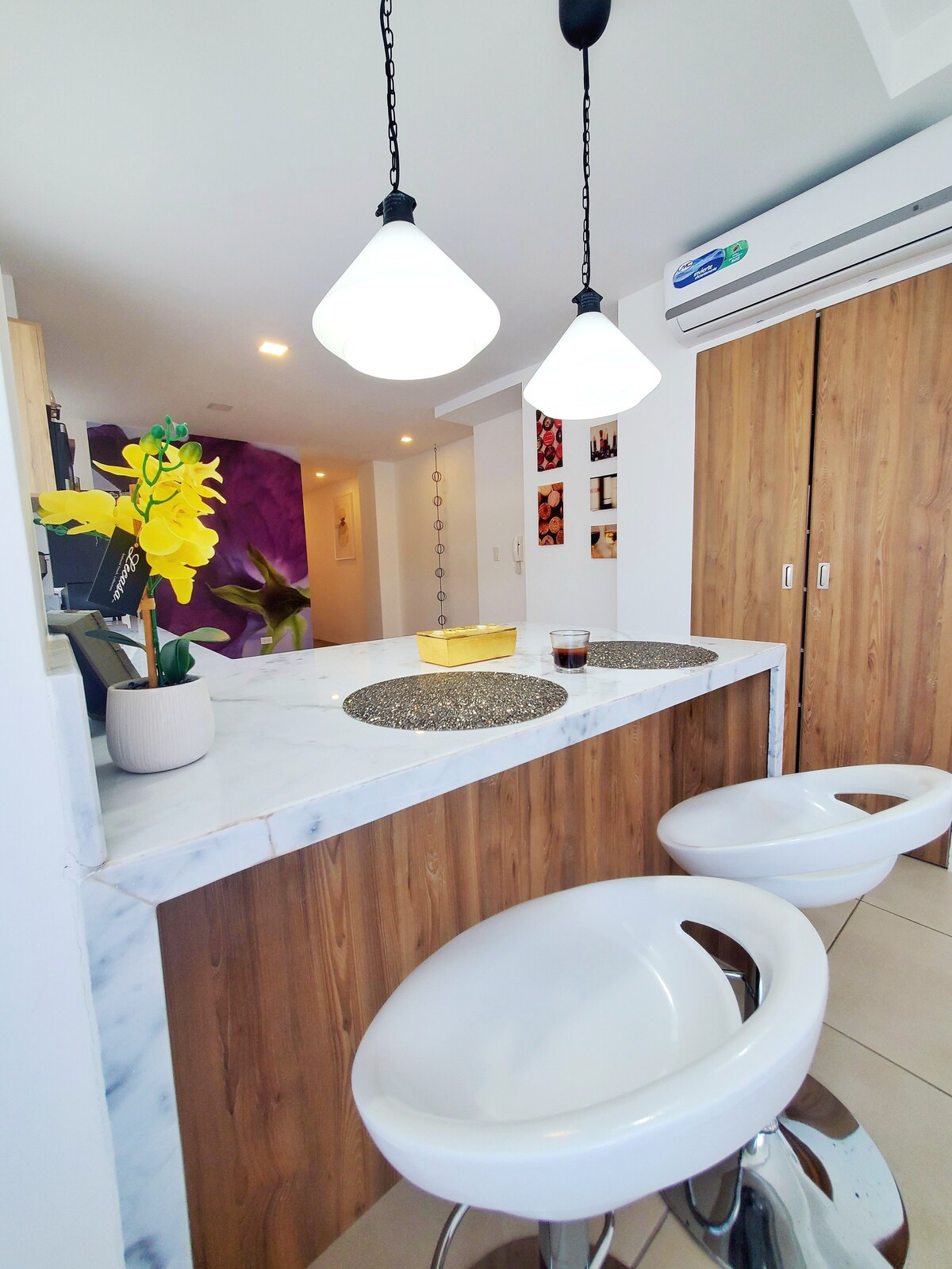 ☞ Oceanview ☞ Piscina ☞ Banheira de hidromassagem ☞ Estacionamento no edifício ☞ Terraço com espreguiçadeiras ☞ Quarto principal com ar condicionado e cama queen ☞ Wi-Fi ☞ Ar condicionado na sala de estar ☞ Cozinha totalmente equipada: ☞ Frigorífico ☞ Micro-ondas ☞ Televisão e um sofá na sala de estar ☞ Utilização das áreas sociais das 10h00 às 22h00