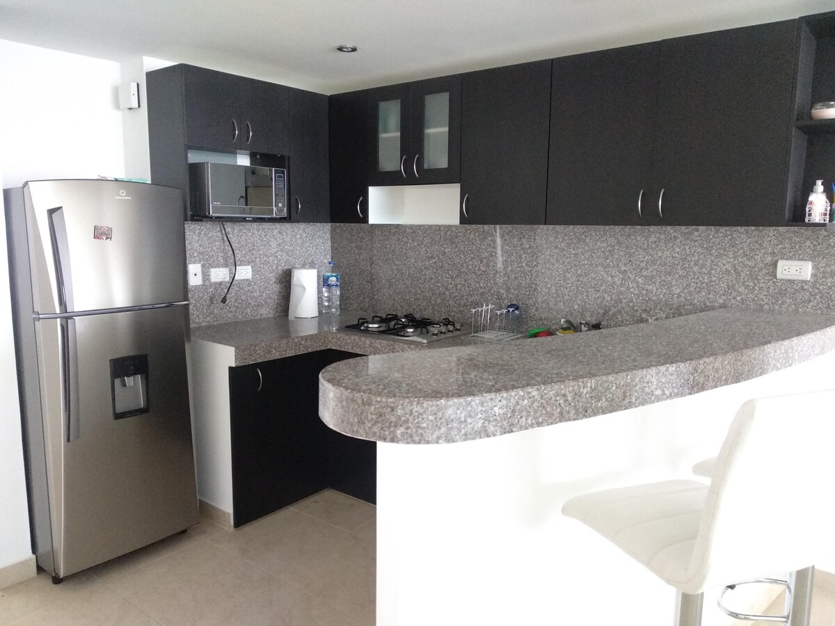 Acomodação em um complexo residencial com vista e acesso ao mar em Ballenita. Tem WIFI, cozinha, serviço de cabo, ar condicionado, chuveiros quentes, grelha e terraço Excelente lugar para descansar e se desconectar da cidade
