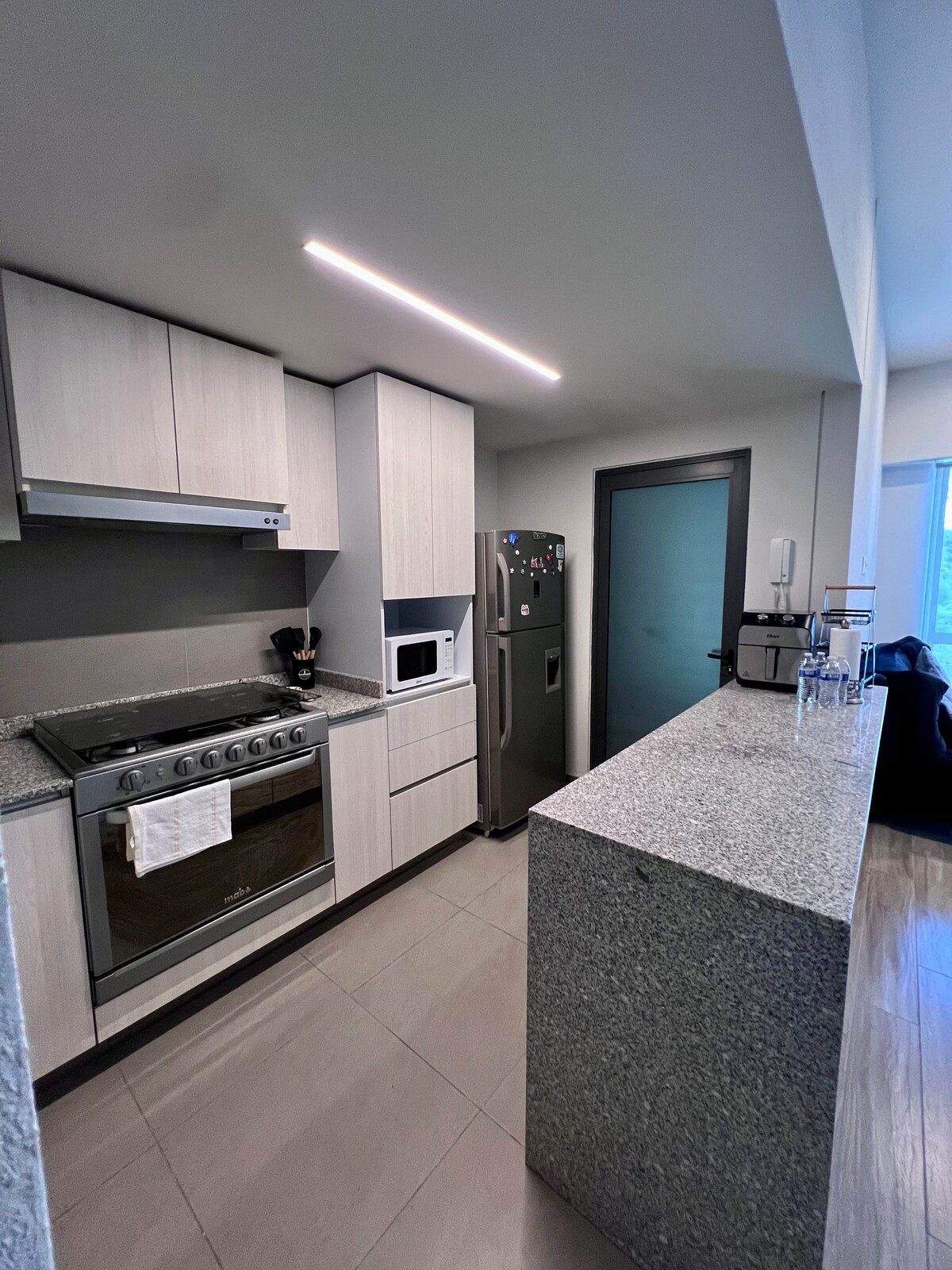 Novo em folha, localizado no coração de Juriquilla, este apartamento de 160 m2 oferece uma experiência única, indo além das comodidades e entretenimento. Se está à procura de alta qualidade, não procure mais e venha para o apartamento mais moderno e luxuoso de Queretaro para uma estadia inesquecível. A uma curta distância a pé do Starbucks, Walmart, bares e restaurantes de topo como o Sonora Grill & Hunger, este apartamento tem tudo, camas confortáveis, varanda, TV OLED 4K e um Home-Cinema de 100" a partir da sua cama