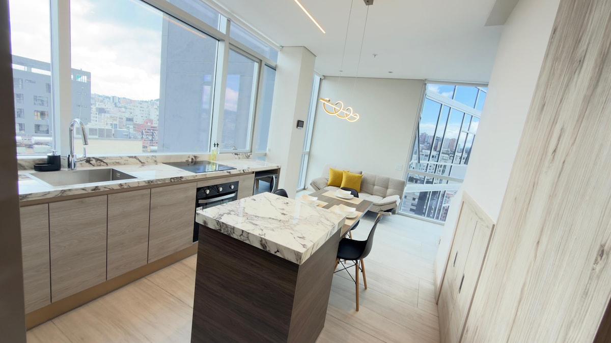Perfecto para tu aventura en Quito!! Este loft de 80m² combina una ubicación inmejorable con un diseño espectacular diseñado para quienes buscan amplitud y estilo. Sus ventanas panorámicas te conectan con la energía de Quito desde la comodidad de tu sofá. Cerca a Parque La Carolina, centros comerciales o disfruta de la vida nocturna y gastronómica sin necesitar taxi. Excelente iluminación y WiFi rápido. Totalmente equipado con todo lo que necesitas para sentirte cómodo desde el primer minuto.