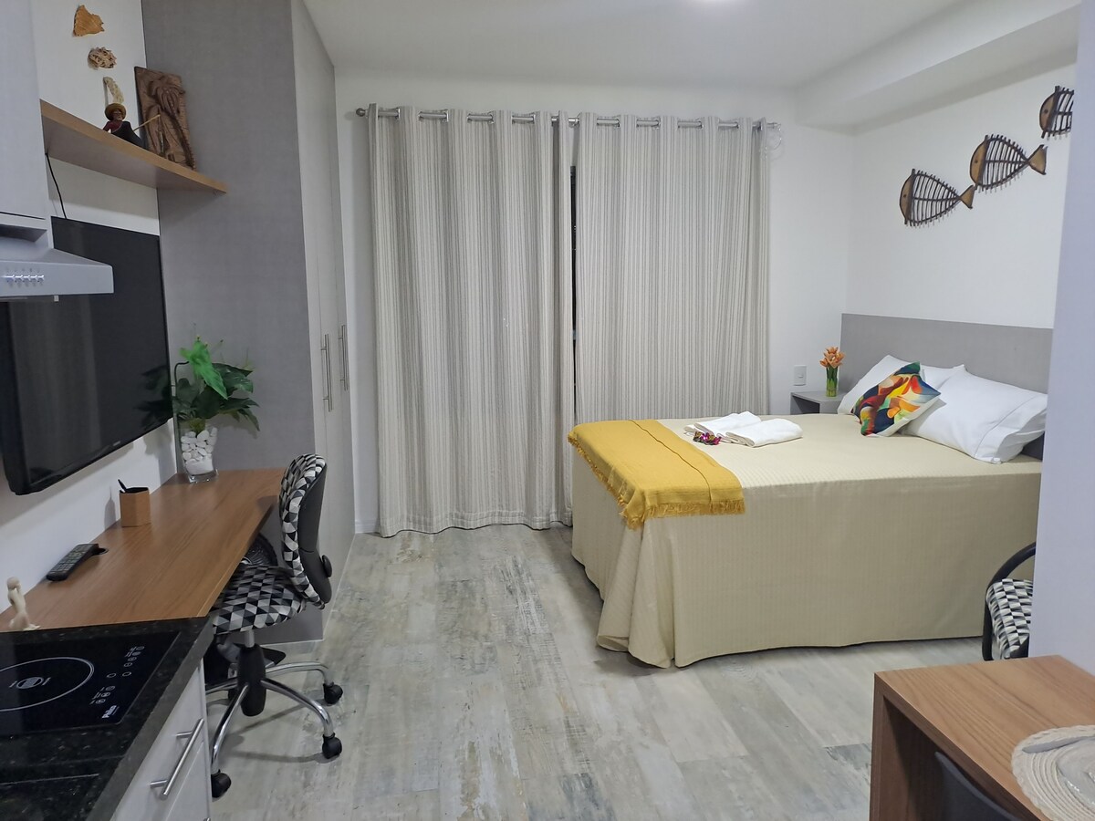 O Studio localizado no Almagah 227, foi projetado com atenção a cada detalhe para oferecer conforto, praticidade e um design moderno. O móvel flexível que vira sofá garante melhor circulação e pode ser usado para reuniões ou momentos de descanso. Há área exclusiva para refeições com futon e mesa, cozinha equipada com geladeira, armário espaçoso e cafeteira de expresso. A iluminação versátil e a smart TV grande completam a experiência.