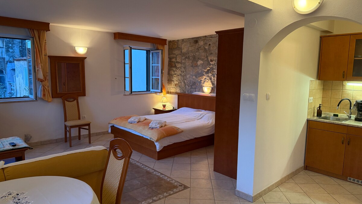 Desfrute do design retrô e elegante desta casa no centro da cidade. O anúncio é novo e renovado. Tem muito amor e toques atenciosos, como obras de arte, antiguidades restauradas e móveis artesanais. Proporciona uma experiência sob o piso de vida à beira-mar. A casa pertencia à famosa família Frankopan e ainda tem seu brasão original na frente da casa. Oferecemos duas casas,elegantemente diferentes, e cada acomodação tem uma entrada separada.