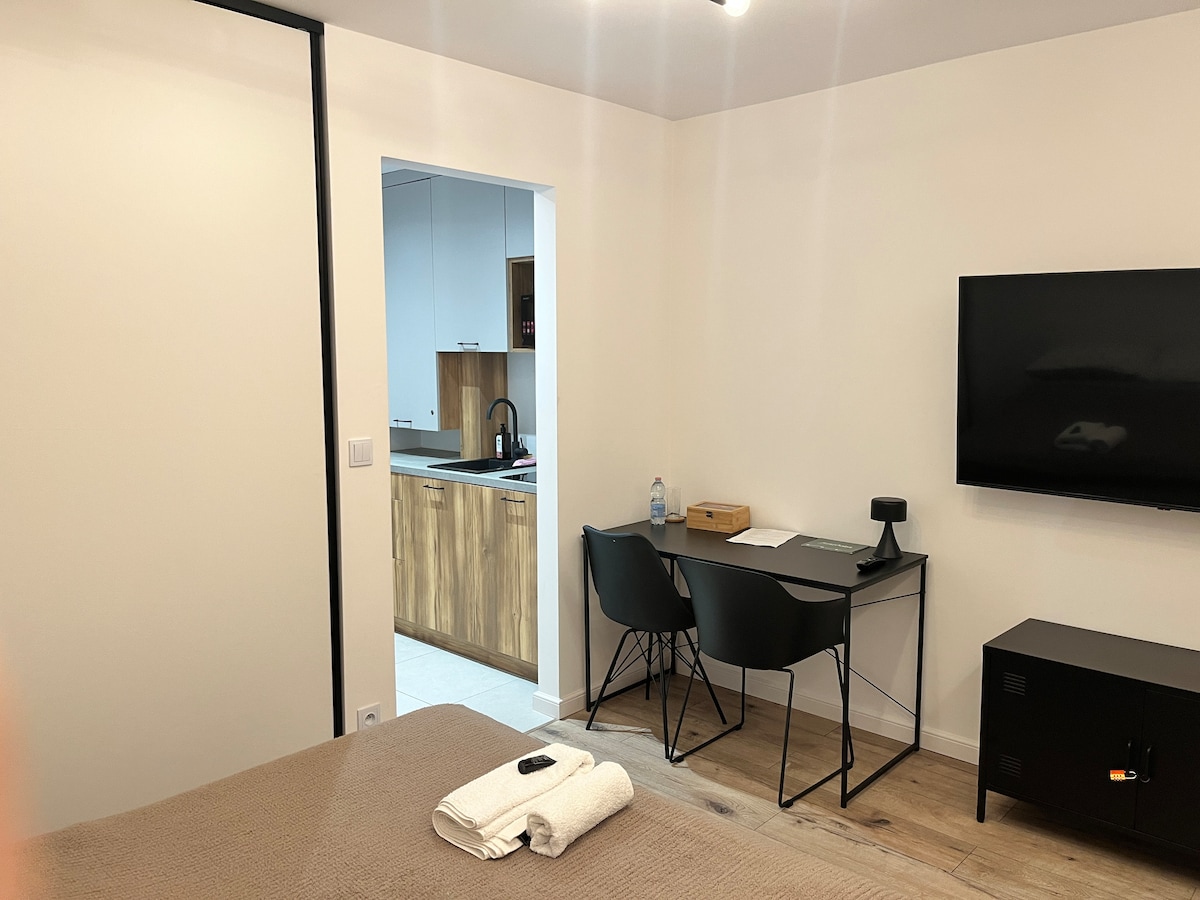 Apartamento moderno e confortável de 50 m² num bairro tranquilo. Excelente localização com fácil acesso a transportes públicos, lojas e pontos de serviço. Layout do apartamento: • Sala de estar com kitchenette: sala de estar com ilha, cozinha moderna com equipamentos básicos (talheres, pratos, panelas, frigideiras) • 2 quartos: sofás-cama confortáveis, edredões e almofadas disponíveis no local • Casa de banho: estética e totalmente equipada. Esteja à vontade para reservar 😊