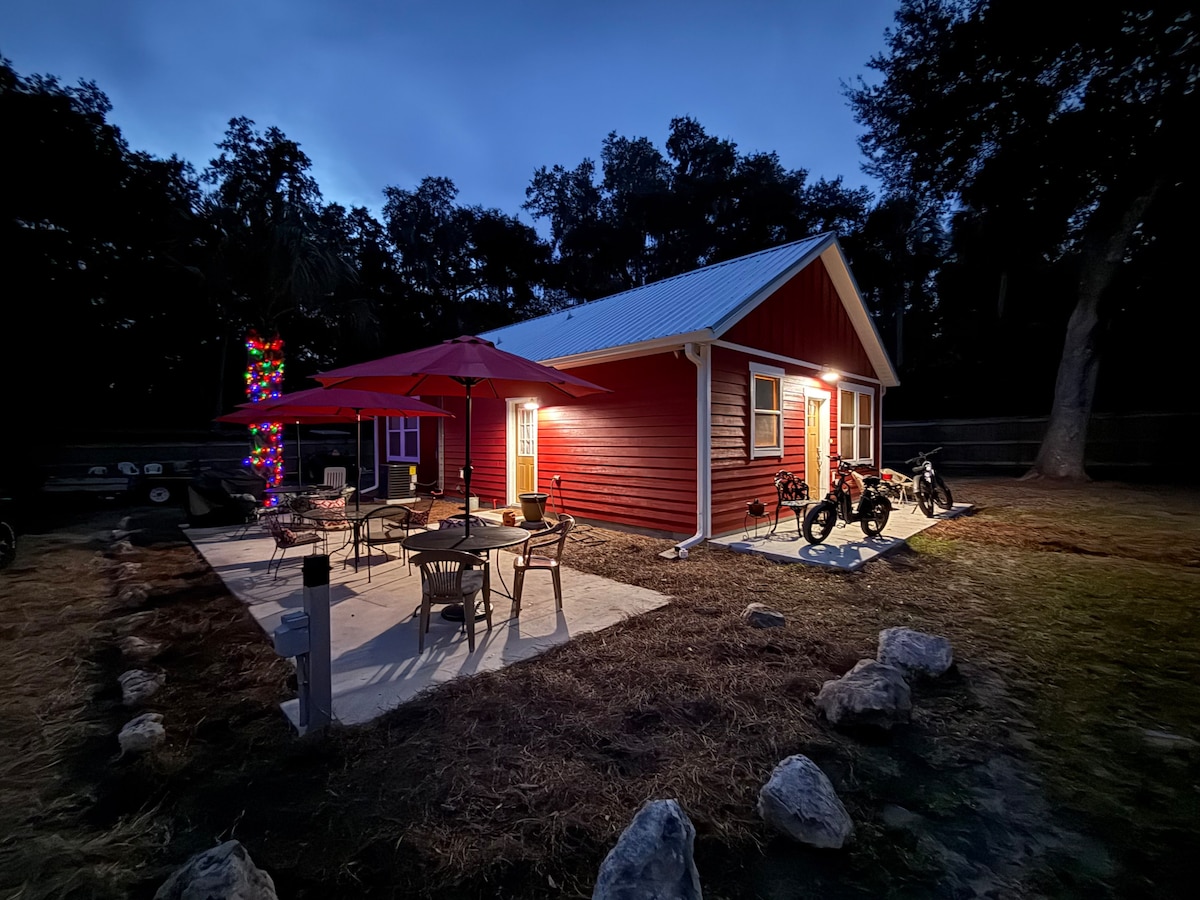 Feel the good vibes on this one-acre retreat. Beautiful trees surround the Cabin & off-grid Hobbit home. The stylish 3-bedroom / 2 bath cabin. Magical outdoor living space for relaxation & connection. Hot tub, fire pit, griddle, corn holes, hammock. Rent the golf cart. Bring or rent a boat to explore the Withlacoochee River, Rainbow River, or Lake Rousseau (boat launch just down the street). The clear blue Rainbow River Spring is a short drive away (rent kayaks & swim at the state park).