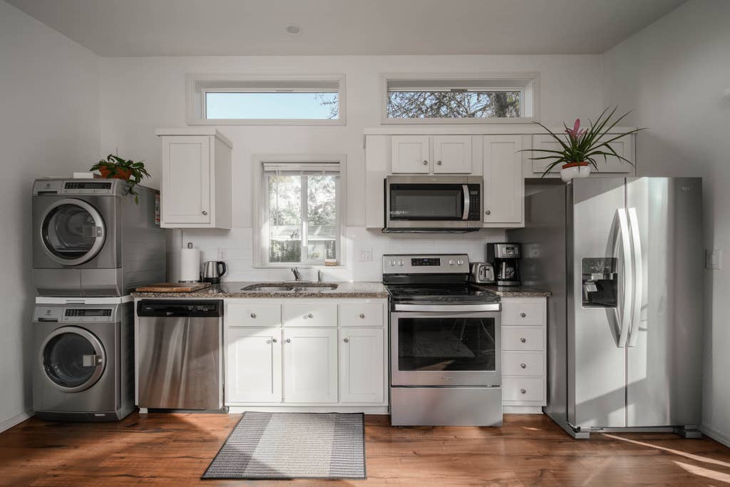 Explore nosso novo bangalô construído por artistas em Multnomah Village, Portland. Este espaço aconchegante acomoda quatro pessoas com uma cama queen no andar de cima e um sofá-cama no andar de baixo. A poucos passos de distância, você encontra cafés encantadores, lojas e um parque com trilhas para caminhadas e parques para cães. Desfrute de atividades locais como bingo e refeições em pátios que aceitam animais de estimação. Completo com itens básicos, incluindo lavanderia e uma área de café da manhã, este bangalô é perfeito para estadias curtas e prolongadas, oferecendo uma experiência única em Portland.